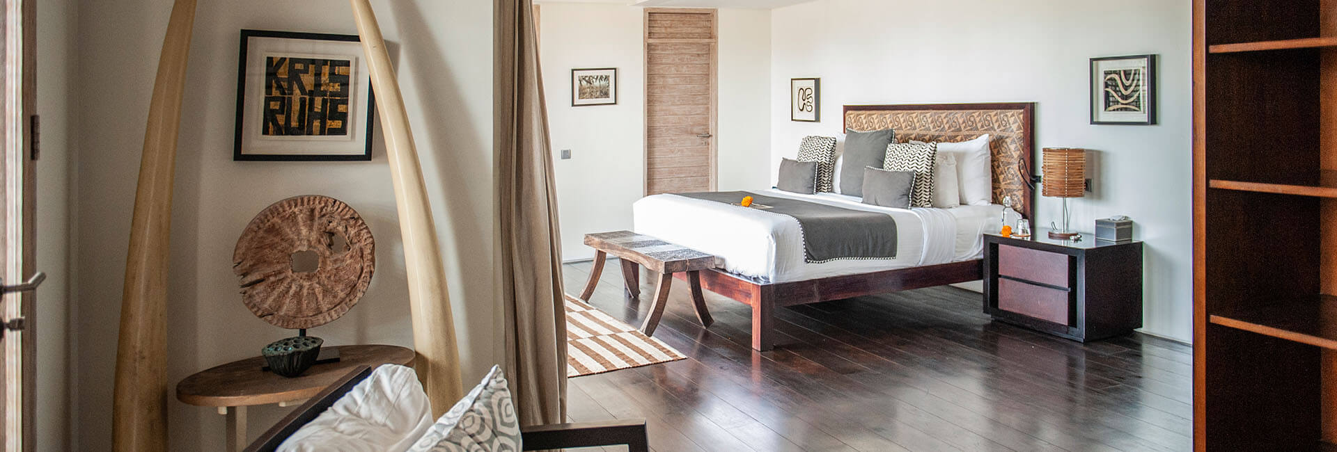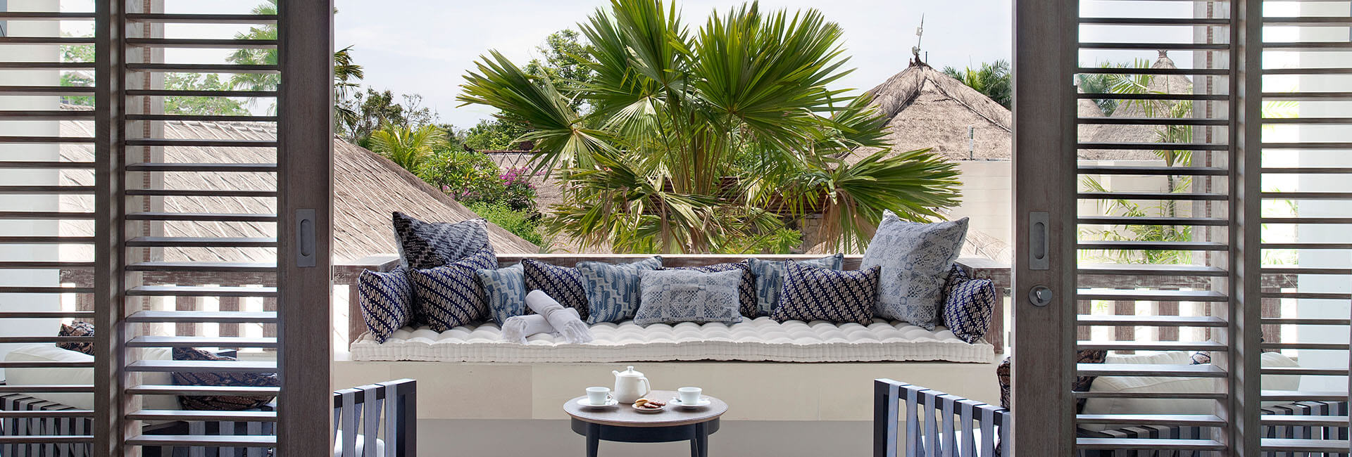 Set amongst lush tropical gardens, the three bedroom Villa Adasa is a haven for lounging and relaxation. Suspended above the 14-metre green-stone-tiled swimming pool, a traditional balé provides the perfect spot to while away the day. Its two king-sized daybeds are generously adorned with cushions, ideal for a massage or a lunch or dinner for two. Nearby, a private roof deck offers a tranquil sunbathing retreat or quiet spot for yoga or meditation.